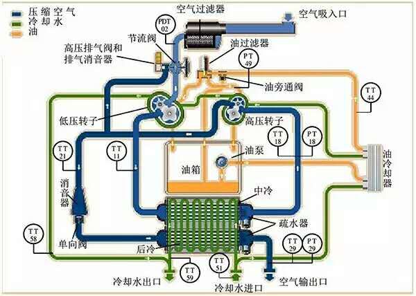 ● 10%空气通过卸荷阀-低压转子-中冷-高压转子,排气消音器-吹干系统内滞留的潮湿水汽。