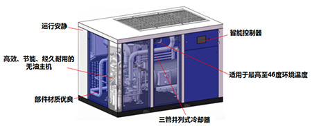 1、运行安静,无油主机高效、节能、经久耐用,智能控制器,三管并列式冷却器,部件材质优良;